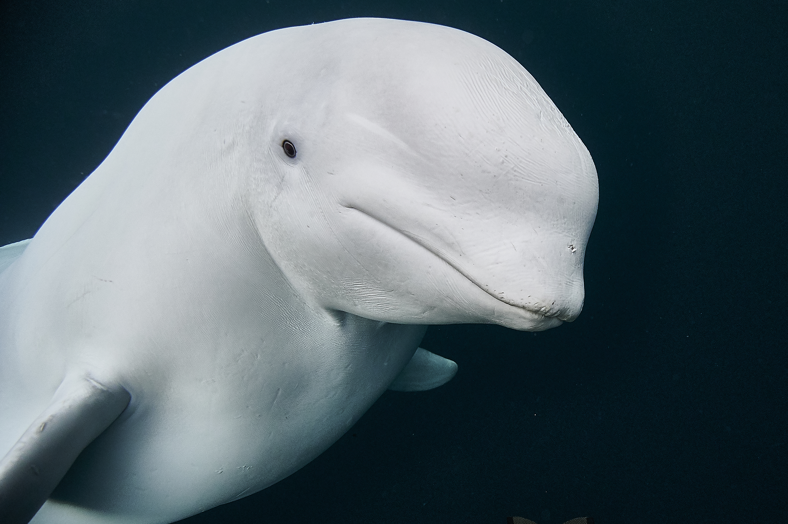 On a technical note conditions were harsh, diving in arctic environment is difficult. Water is cold and outside temperatures are below -10°c. Both gear and freediver are affected: our thick wetsuits don’t allow us the freedom of movement we are used to, the cold makes us less relaxed and shorten our dive time. The photo equipment suffers, battery life is reduced even in an aluminium housing. Natural light is low and modern sensors help a lot to get decent images. The dynamic range of the Nikon Z6 helped me a lot to focus on the encounter instead of being stressed by the quest for the right exposure, the white whale on dark water background would have been tricky to expose with sensors we had 10 years ago.