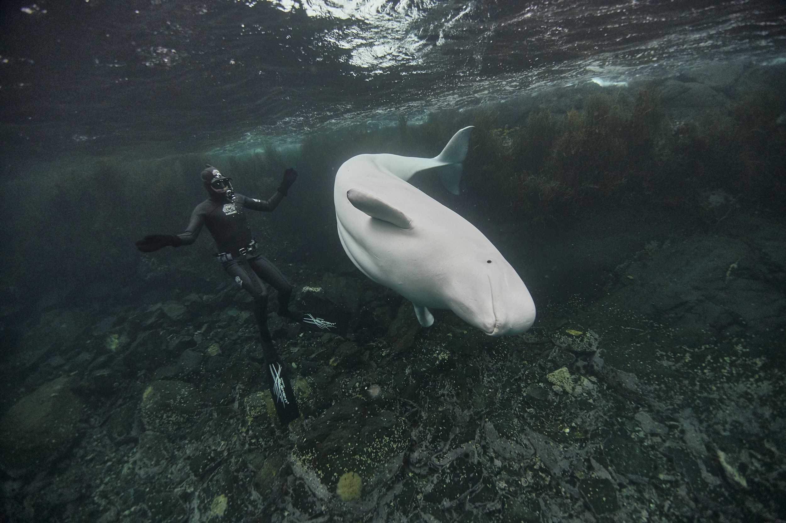 On a technical note conditions were harsh, diving in arctic environment is difficult. Water is cold and outside temperatures are below -10°c. Both gear and freediver are affected: our thick wetsuits don’t allow us the freedom of movement we are used to, the cold makes us less relaxed and shorten our dive time. The photo equipment suffers, battery life is reduced even in an aluminium housing. Natural light is low and modern sensors help a lot to get decent images. The dynamic range of the Nikon Z6 helped me a lot to focus on the encounter instead of being stressed by the quest for the right exposure, the white whale on dark water background would have been tricky to expose with sensors we had 10 years ago.