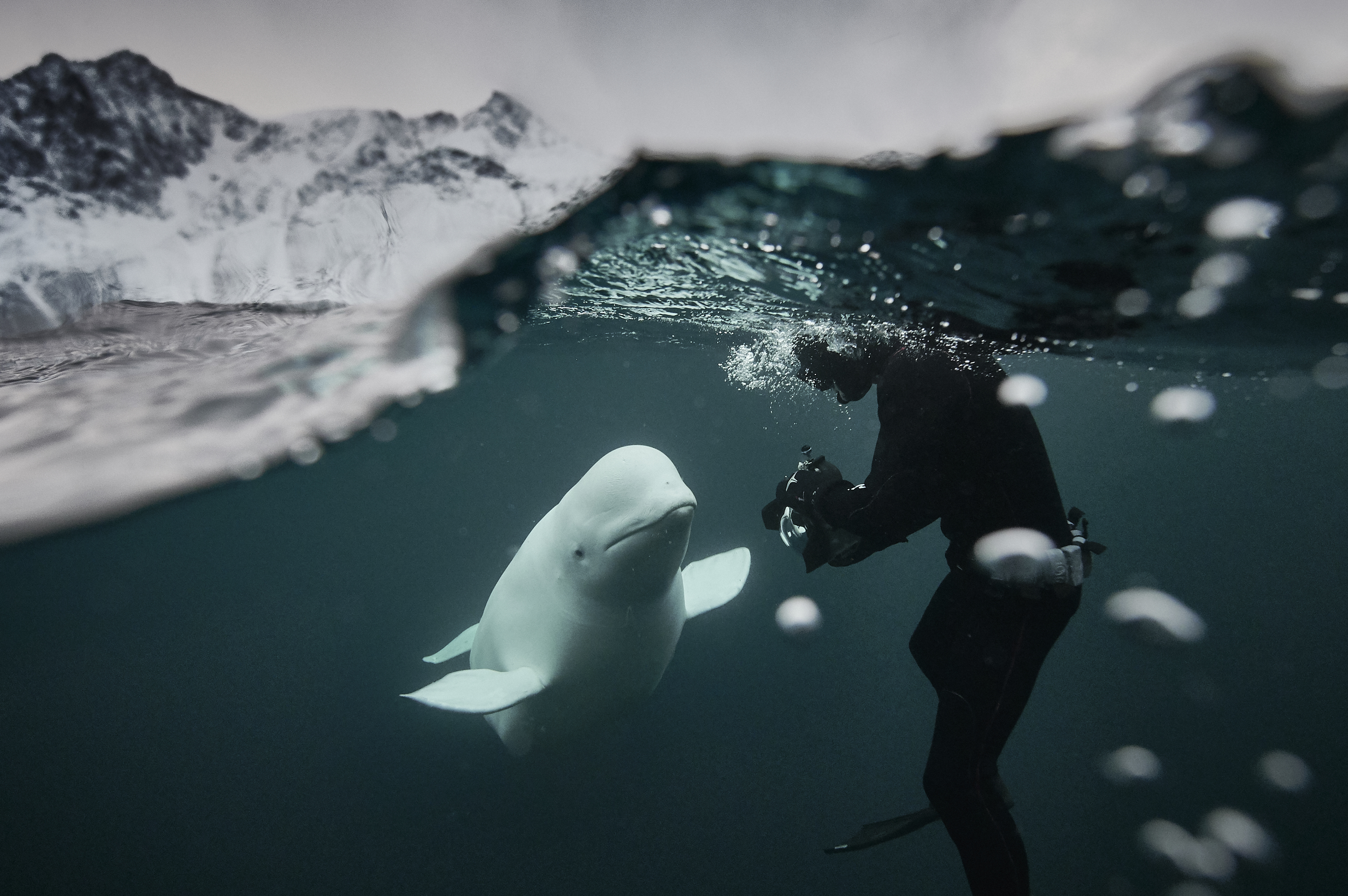 On a technical note conditions were harsh, diving in arctic environment is difficult. Water is cold and outside temperatures are below -10°c. Both gear and freediver are affected: our thick wetsuits don’t allow us the freedom of movement we are used to, the cold makes us less relaxed and shorten our dive time. The photo equipment suffers, battery life is reduced even in an aluminium housing. Natural light is low and modern sensors help a lot to get decent images. The dynamic range of the Nikon Z6 helped me a lot to focus on the encounter instead of being stressed by the quest for the right exposure, the white whale on dark water background would have been tricky to expose with sensors we had 10 years ago.