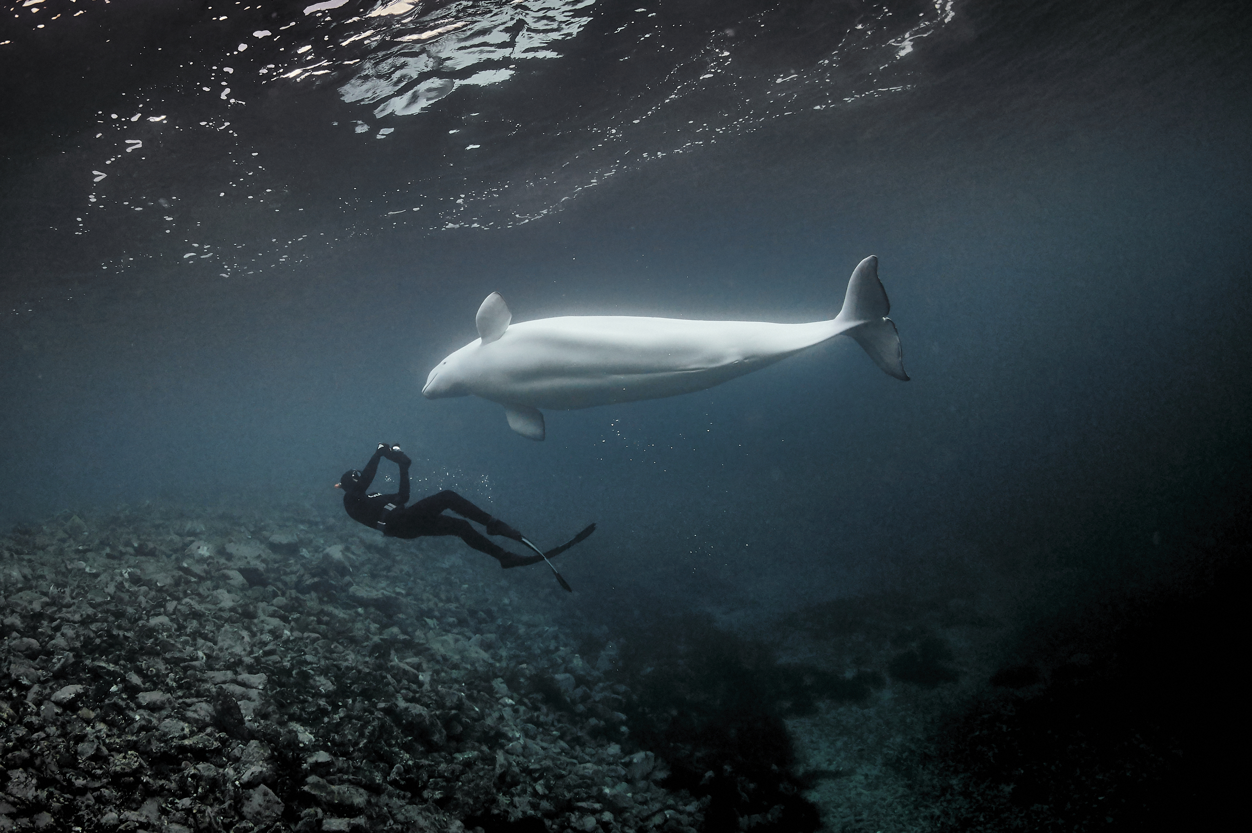 On a technical note conditions were harsh, diving in arctic environment is difficult. Water is cold and outside temperatures are below -10°c. Both gear and freediver are affected: our thick wetsuits don’t allow us the freedom of movement we are used to, the cold makes us less relaxed and shorten our dive time. The photo equipment suffers, battery life is reduced even in an aluminium housing. Natural light is low and modern sensors help a lot to get decent images. The dynamic range of the Nikon Z6 helped me a lot to focus on the encounter instead of being stressed by the quest for the right exposure, the white whale on dark water background would have been tricky to expose with sensors we had 10 years ago.